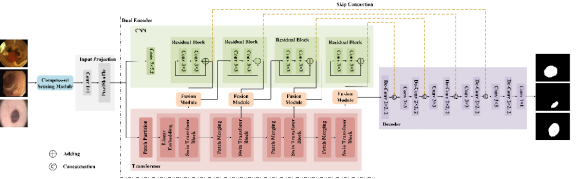 通过细致的探索与分析,发现在模型的编码器或共享层部分利用Transformer与CNN的优势,能够显著增强模型的特征提取能力,从而优化其性能。相关研究成果已在Biomedical Signal Processing and Control及Computers in Biology and Medicine等顶级学术期刊上发表,相关模型结构如图1-2所示。本部分前期研究与本项目的关联点在于:前期研究中的网络设计通过Transformer捕捉全局特征,同时利用卷积神经网络(CNN)精确提取局部特征,这种方式使得模型能够获取到更为丰富且全面的特征信息,进而显著提升了诊断的准确性。这一网络设计思路为本项目的网络架构提供了宝贵的参考和坚实的理论依据。
