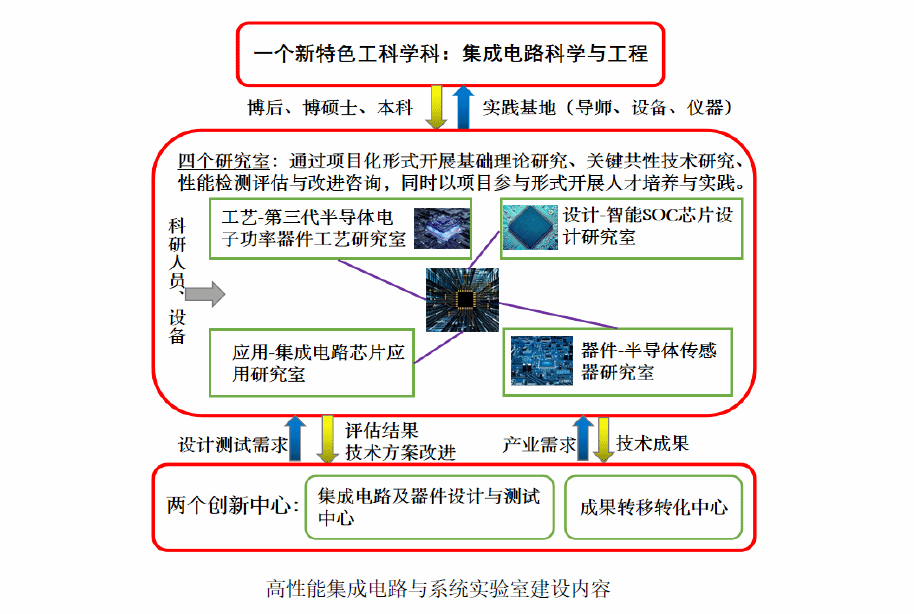 高性能集成电路与系统重点实验室(下称“实验室”)下设四个研究室,包括“第三代半导体电子功率器件工艺研究室”、“智能SoC芯片设计研究室”、“半导体传感器研究室”和“集成电路芯片应用研究室”,重点围绕第三代半导体与集成电路工艺、元器件、芯片设计、集成电路应用四个方向展开研究。