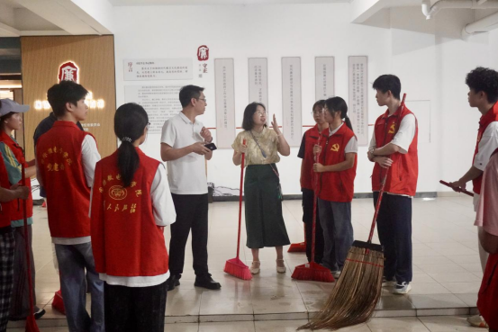 行动迅速,师生携手显担当。 在学院的号召下,教师们以身作则,党员志愿者们踊跃参与,迅速组成了一支充满干劲的先锋队伍。他们手持清洁工具,深入宿舍楼的各个公共区域,重点对阳台、楼道、绿化带等易积水的卫生死角进行“地毯式”排查与清理。老师们不仅指挥协调,更亲自弯腰清理垃圾、翻盆倒罐清除积水,用实际行动诠释了责任与担当。