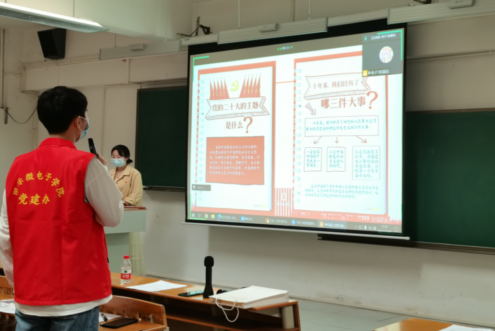 电子学生第一党支部开展主题党日活动。支部书记陈亚莉主持,支部全体党员参加。活动主题为学习党的二十大报告内容。活动方式为书记领学和知识问答。