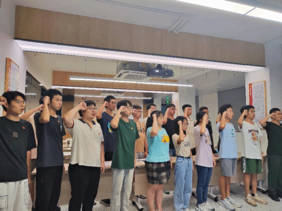 宣誓前,学院党委委员、组织员王凌卿老师代表学院党委向2023年上半年入党的21位新党员表示衷心祝贺,并和学生老党员林智伟等为新党员佩戴党员徽章。随后,王凌卿老师领誓,老党员重温入党誓词,新党员们面对党旗郑重宣誓,洪亮的声音响彻现场。