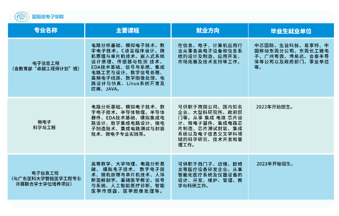 学院现有微电子科学与工程、电子信息工程2个本科专业,学院是电子信息专业硕士点培养支撑单位之一。其中电子信息工程专业是目前全校唯一的国家级特色专业,还是国家卓越工程师计划试点专业、国家级一流本科专业建设点,校友会2023年全国本科专业排名第10名。