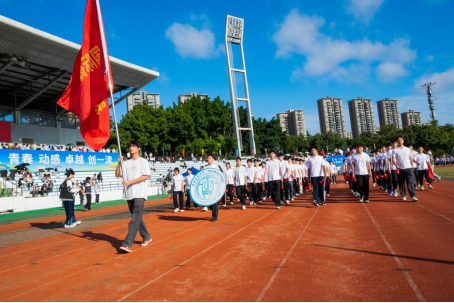 方阵迈着铿锵有力的步伐,以昂扬之姿步入运动场。全体师生身着统一服装,精神抖擞,队列整齐,在晨光中汇成一道流动的白色星河。红旗迎风招展,与运动场上跃动的青春色彩交织相融,在秋日的晴空下,共同奏响了新征程上梦想启航的奋进乐章。