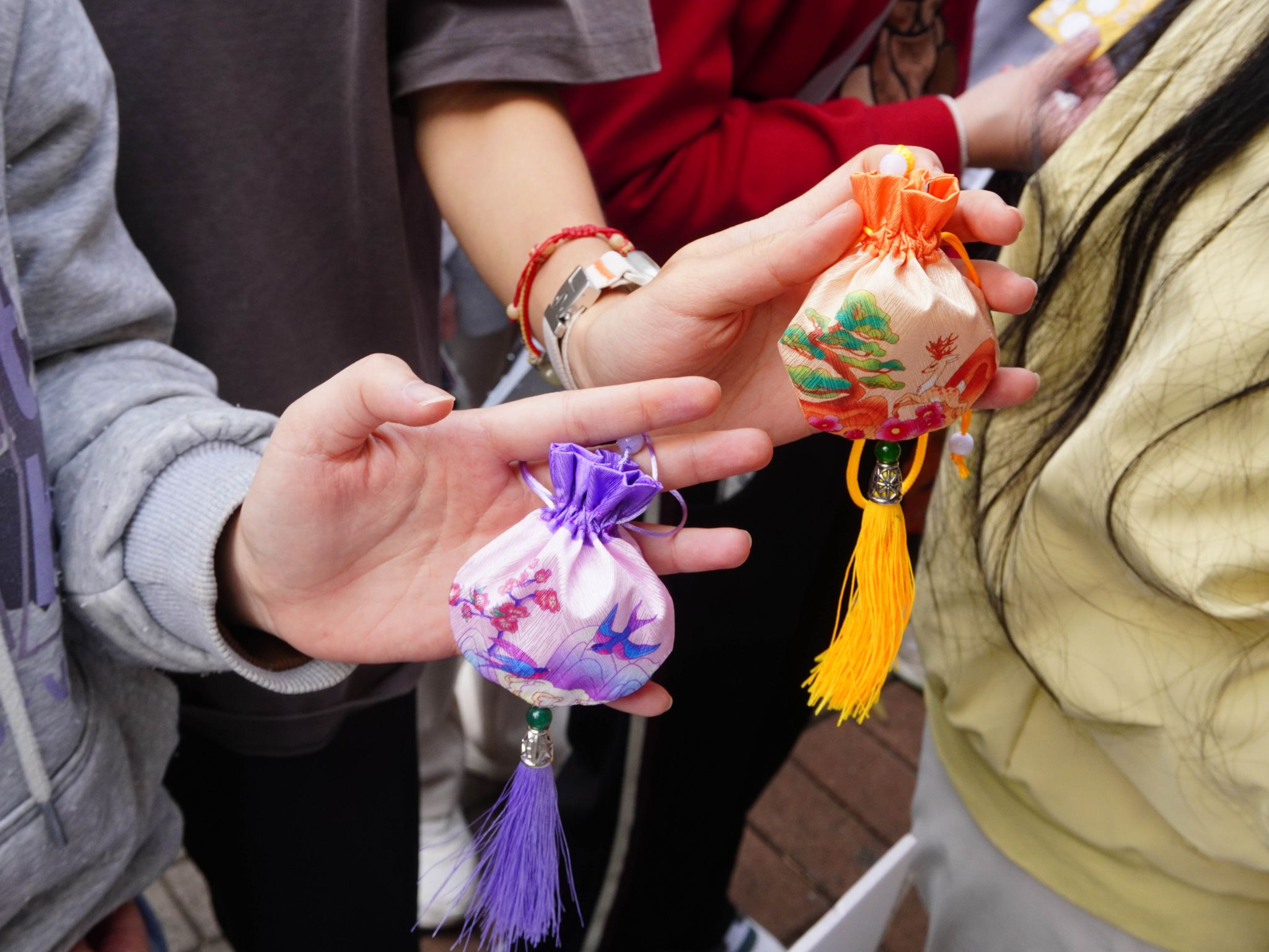 活动现场,四大摊位各展风采。“香启廉心”摊位设置灯谜、香囊二选一体验,同学们或沉吟猜谜,或巧制香囊,让“廉”心在潜移默化中生根发芽;“正义漆扇”摊位由参与者执扇而作,天然漆料在扇面上挥洒,感受千年漆艺从流动到凝固的生命律动;“妙手染青团”摊位上,国家级非遗扎染于此邂逅青春,蓝白相映的图案,是写意在素布上的独一无二的东方诗篇;“拼创未来”摊位将电子元件拆解为模块化拼块,学子们在拼接中感受电子技术的秩序之美,实现科技与非遗的创意融合。