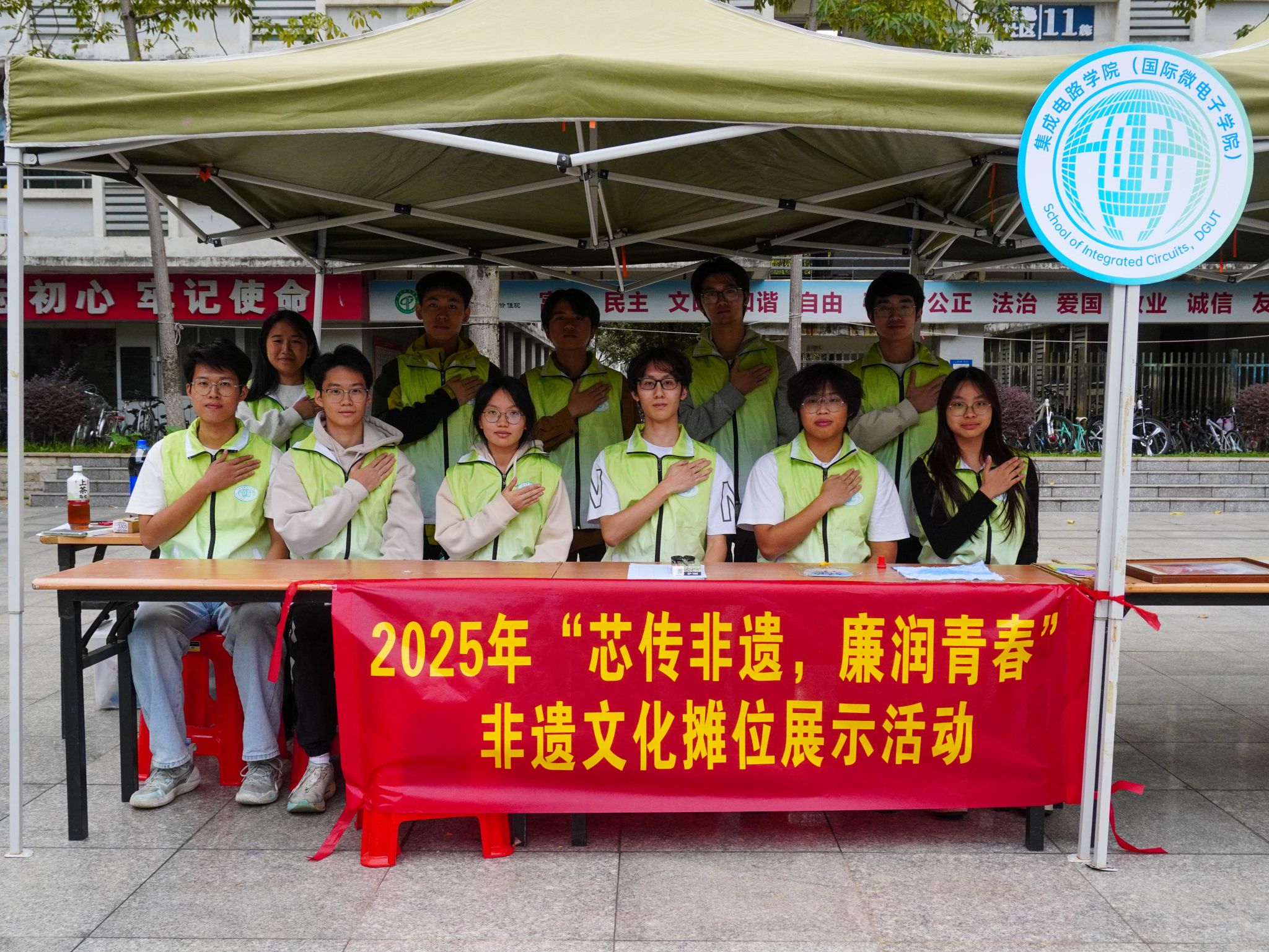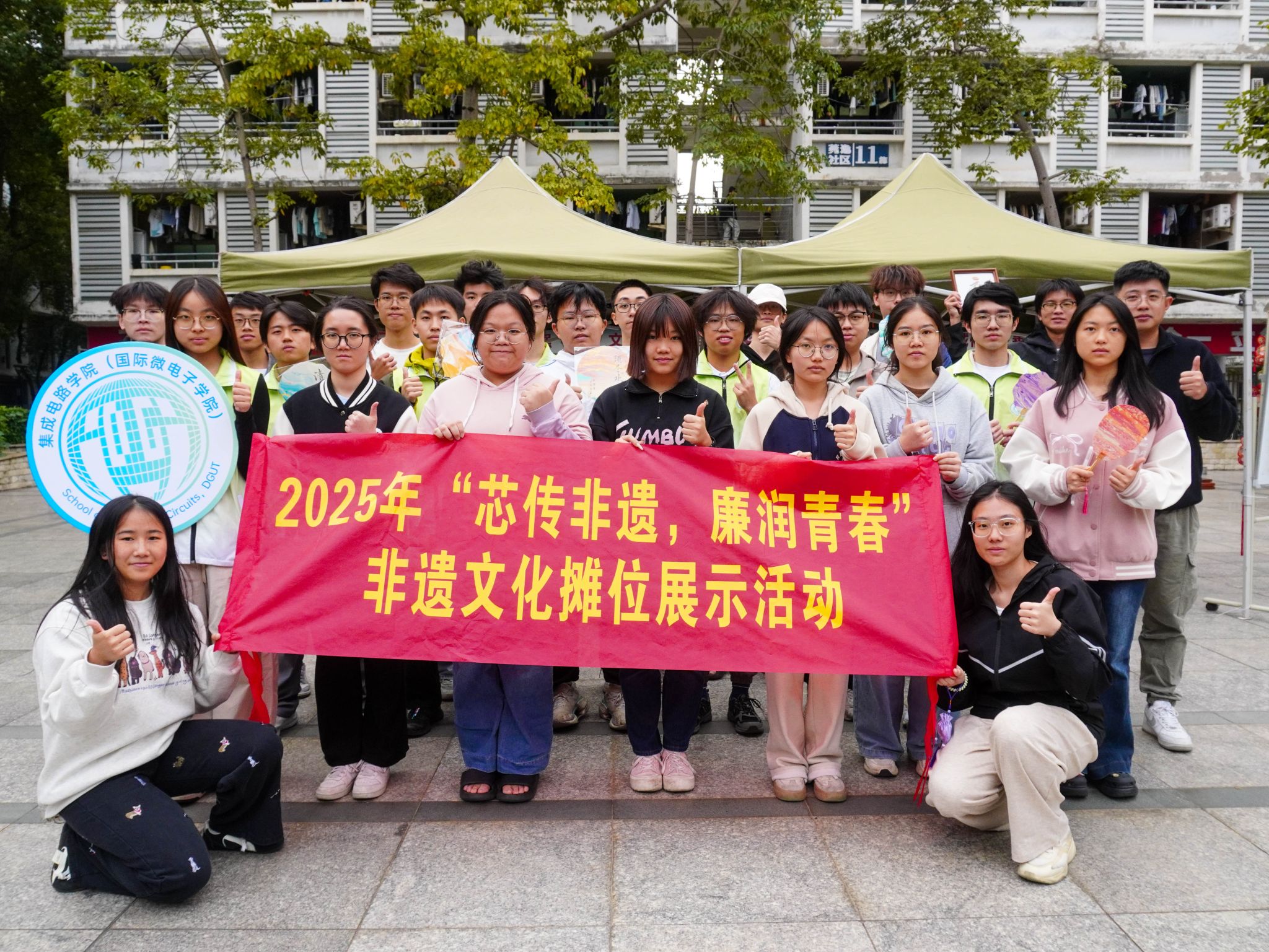 )和青莲育人辅导员工作室承办的“芯传非遗,廉润青春”非遗文化摊位展示活动圆满举行。本次活动以“非遗传承+科技创新”为主题,精心设置四大特色展区,吸引了近300名同学参与。通过集章互动与摊位评选等环节,同学们在趣味体验中深入感受了传统文化的魅力与不同学科的独特风采。