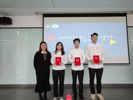 卢楚韵老师为临时团组织负责人郭子腾和临时学生会负责人刘世达、林展鹏颁发聘书。