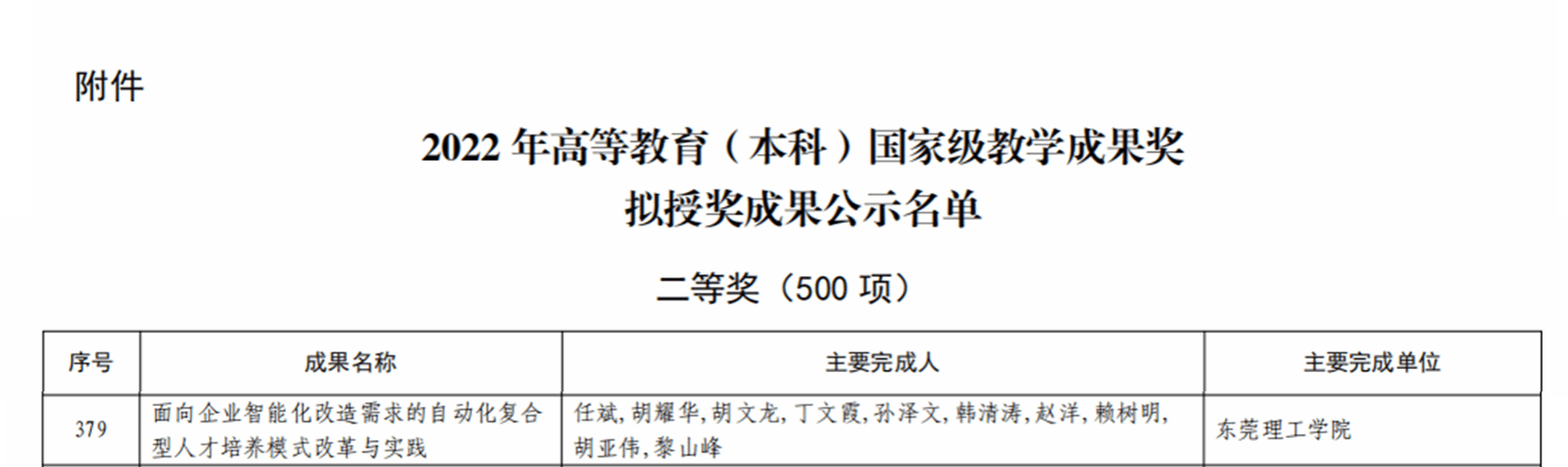 近日,2022年高等教育(本科)国家级教学成果奖公示完毕,由我院任斌教授主持的《面向企业智能化改造需求的自动化复合型人才培养模式改革与实践》获二等奖。