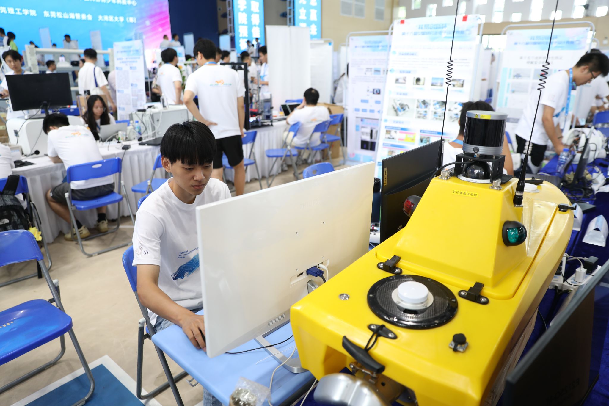 挑战赛现场,我院“智能航行”队和来自武汉大学、浙江大学、华中科技大学等高校的团队同台竞技,从研究背景、创新点、应用前景等多个方面对作品“无人艇集群控制系统”进行了全面介绍。精彩的展示得到参赛师生和专家评审的一致认可,荣获“研电之星”最高荣誉称号。