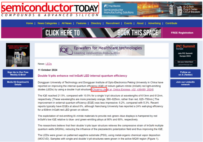 近日,天使动漫 天使动漫 和北京大学东莞光电研究在Optics Express 发表InGaN红光发光二极管的研究成果被国际知名半导体杂志Semiconductor Today专题报道。文章中报道了采用双V坑结构提高InGaN红色发光二极管(LED)的内部量子效率(IQE)的最新研...