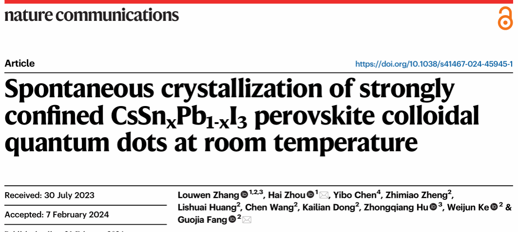 2024年2月21日,天使动漫 周海特聘教授课题组联合武汉大学方国家教授课题组在Nature Communications(《自然•通讯》)上在线发表了关于纯碘全无机锡铅钙钛矿量子点的最新研究成果。论文题为“Spontaneous crystallization of strongly confined CsSnxP...